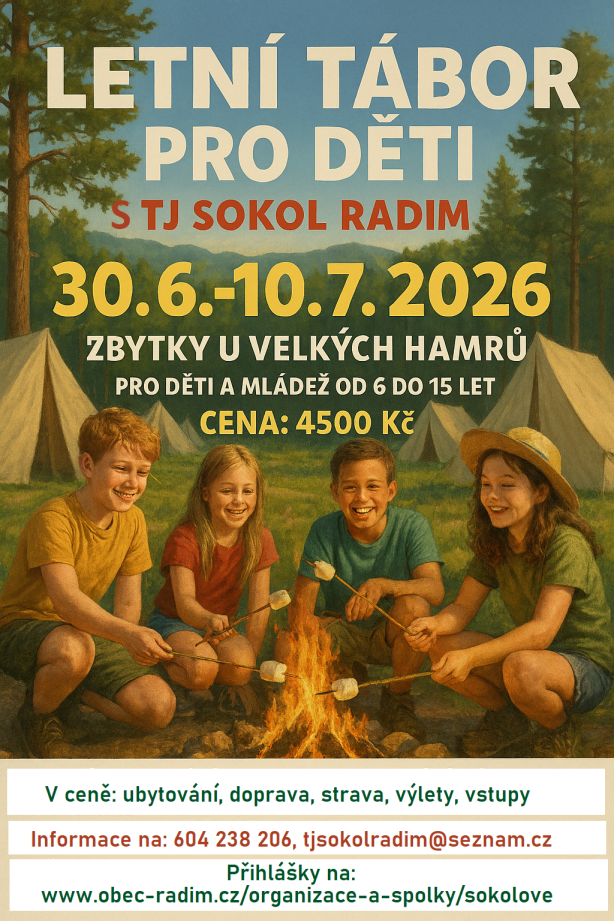 Přihláška na letní tábor TJ Sokol Radim 2026 Typ: PDF dokument, Velikost: 93.87 kB